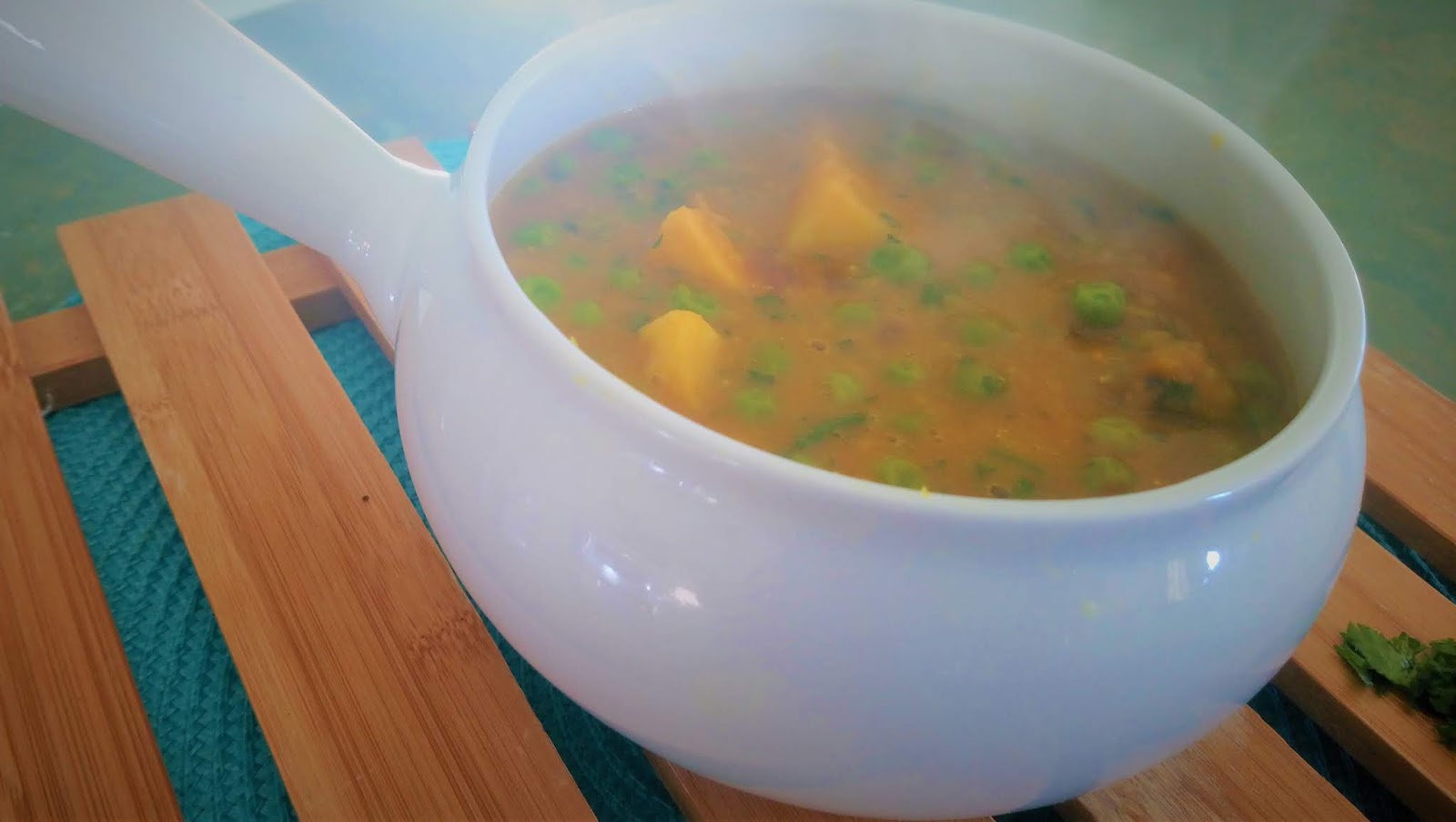 - Heat oil in a large pan over medium heat, add onion, garlic, ginger, stirring for 3 to 5 minutes or until onion become softened. Add tomato, turmeric powder, stir for 2 minute, add boiled split pea mixture, add 1/2 cup cold water to pan, bring to the boil 5 minute and add boiled potato and frozen pea, stir to combine, cook for 10-11 minutes until peas are tender or add water according to consistency. Gently press the green pea with the back of a spoon. if they are tender, it means they are ready.