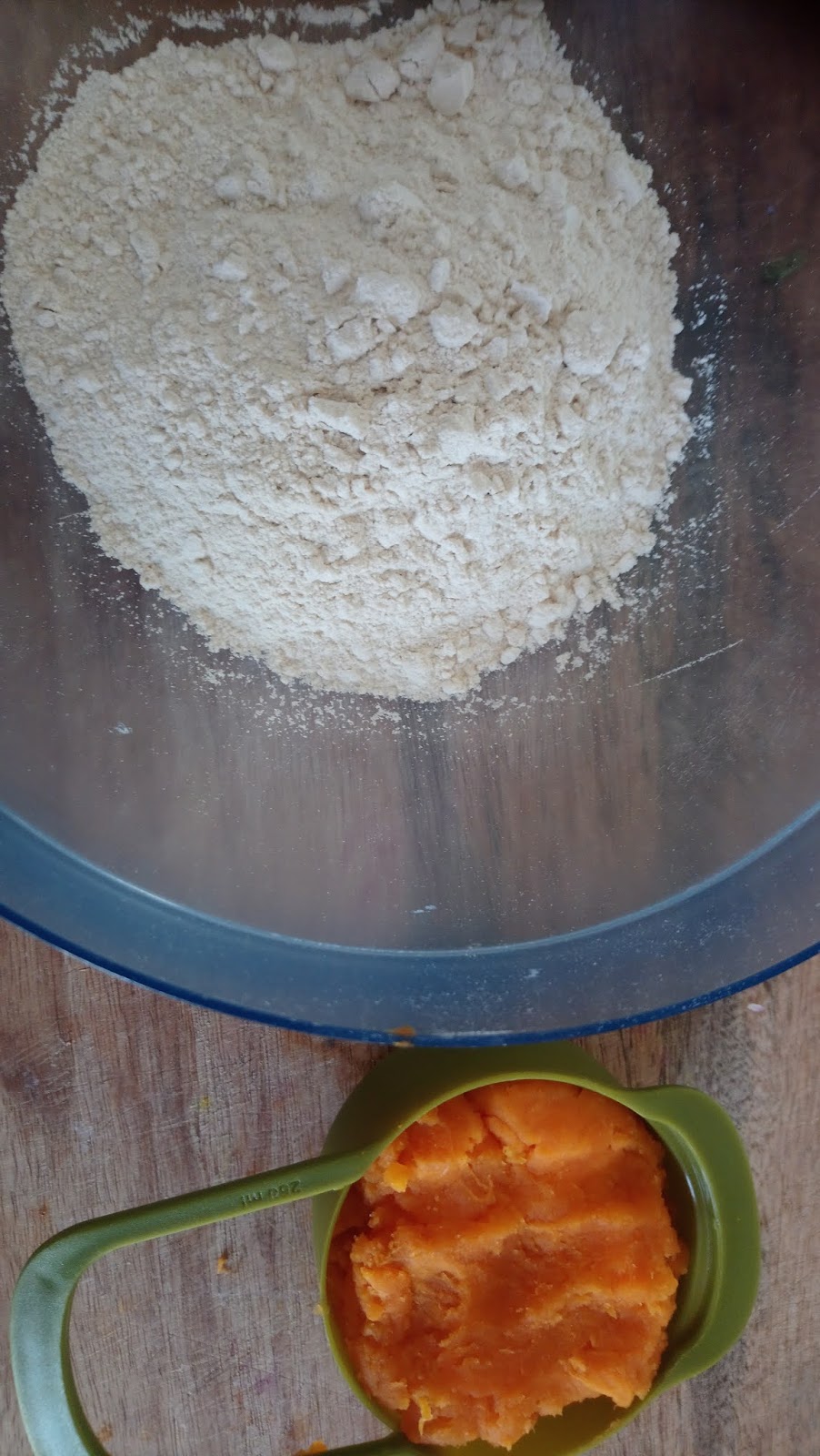 - In a bowl take one cup of whole wheat flour and boiled mashed sweet potato and gradually mix it and just add few's drops of water and make a nice dough,and then cover it for 5 minutes,it become soft dough.